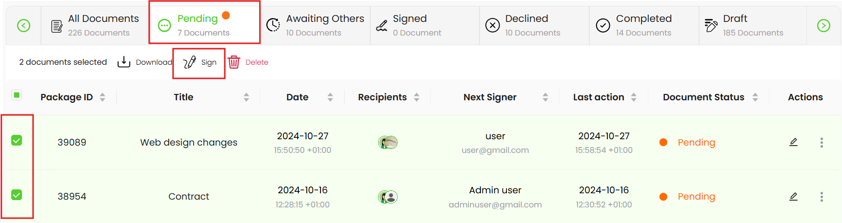 - From your documents list, locate and select the pending document(s) to sign. You can select up to 50 documents.